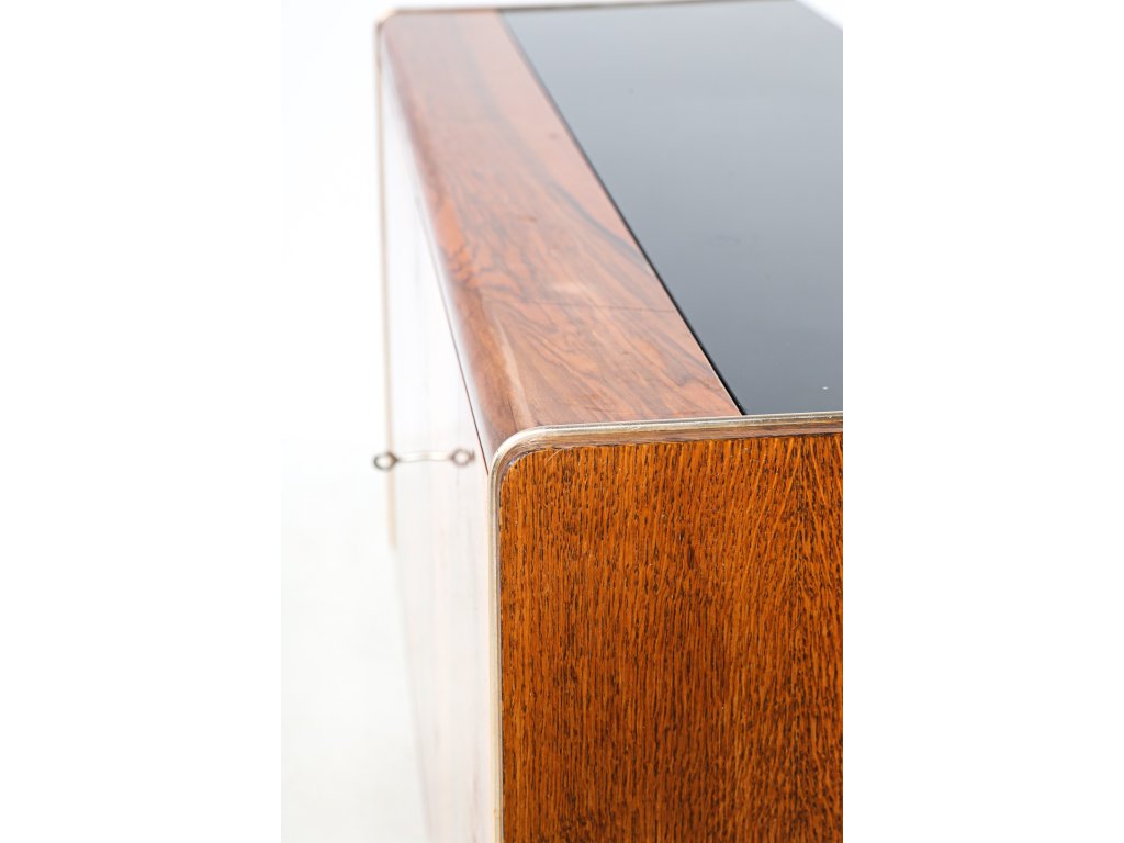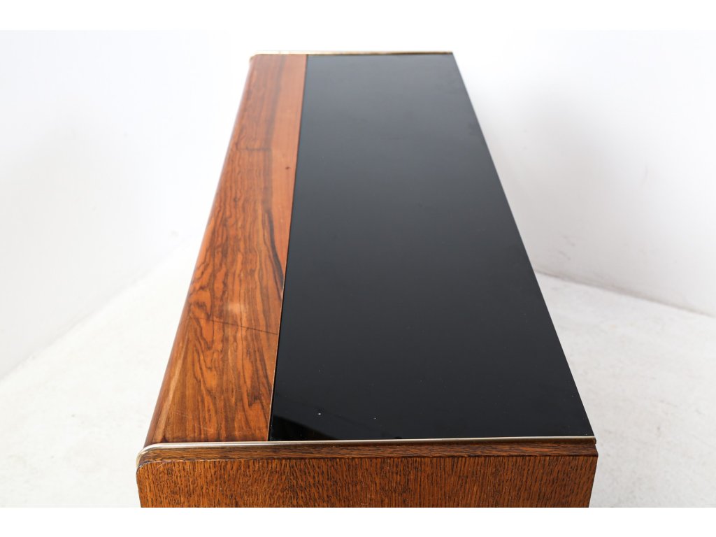 Dřevěná dýha místy poškozena, vysoký lesk. Opaxitové sklo.