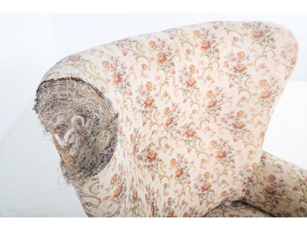 Roh opěrky obnažený, chybí látka.
