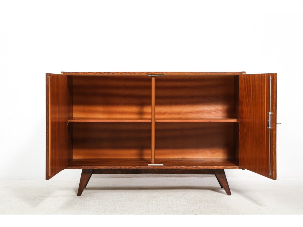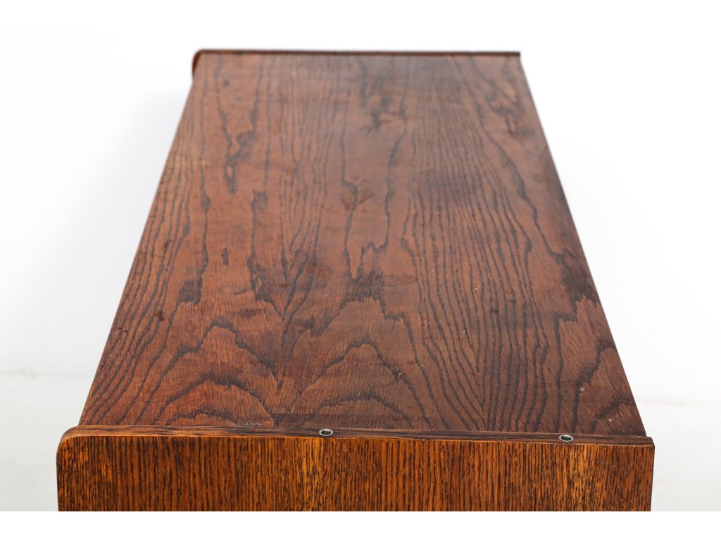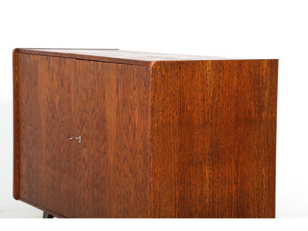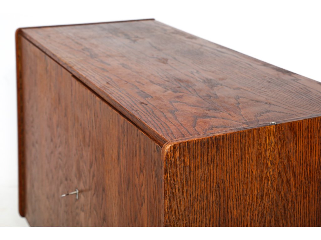 Spodní skříňka posazena na podnoží s šikmými nožkami. Dýha místy s oděrkami.