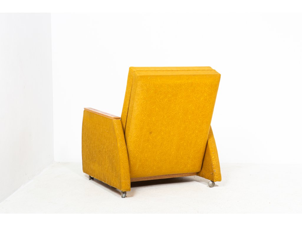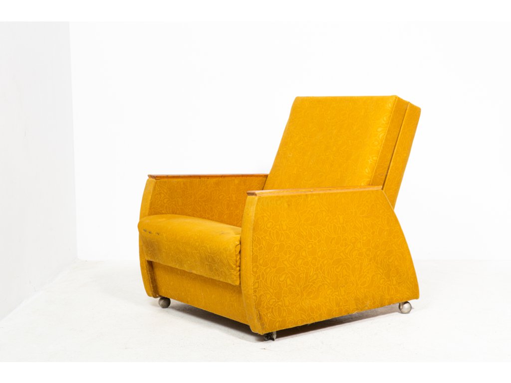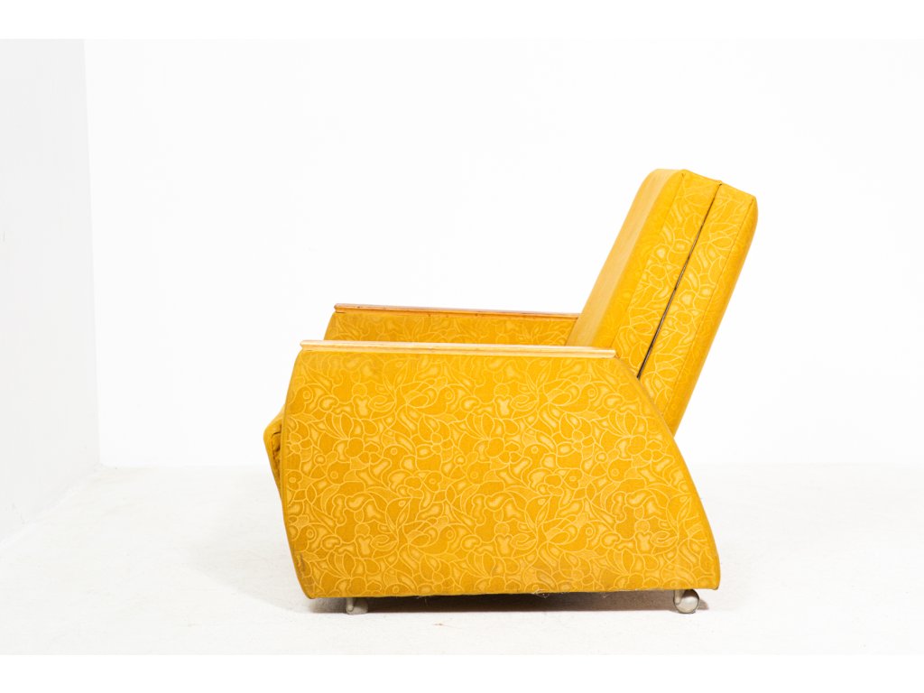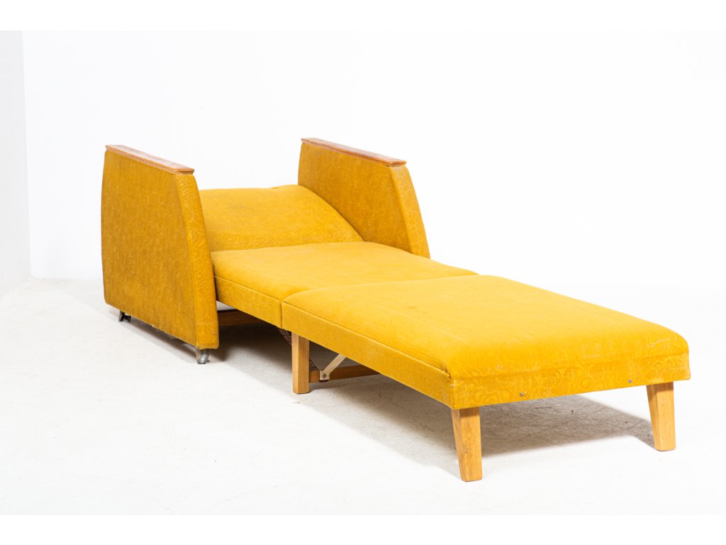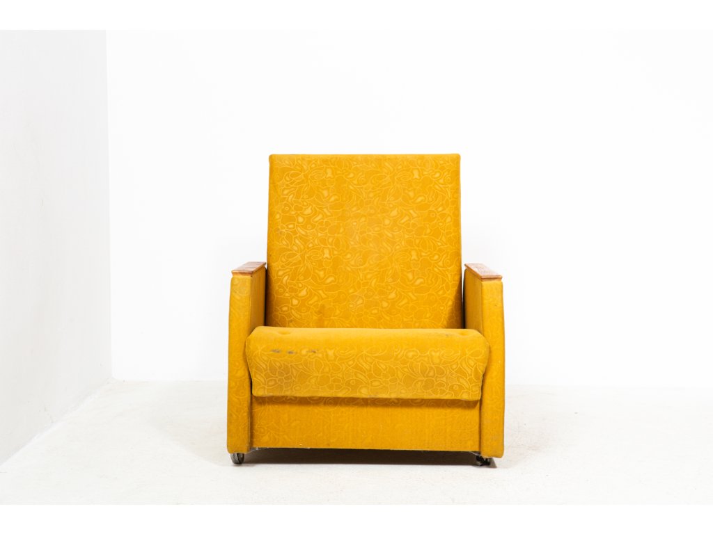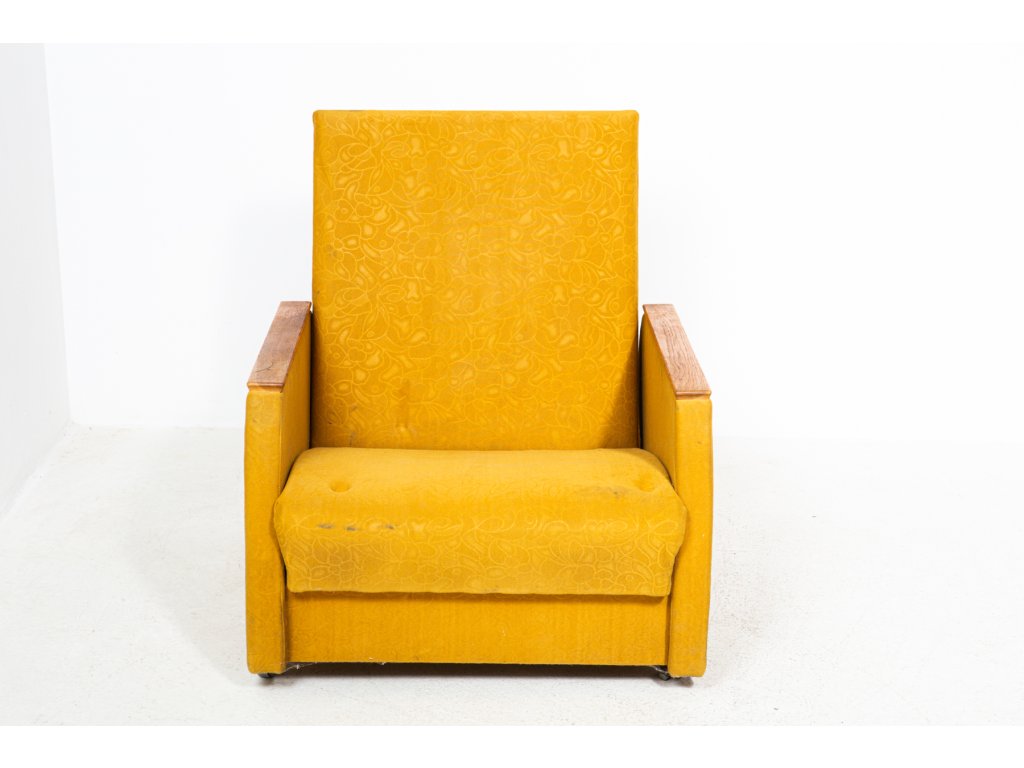 Konstrukčně stabilní, čalounění s trhlinami. Retro, socialismus, 70. léta. Používané, stav viz foto.