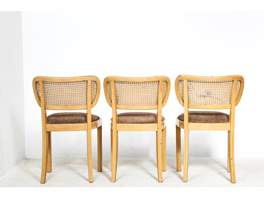 Konstrukčně stabilní, čalouněné podsedáky s kovovými pružinami. Pedigový výplet na opěrkách. Stav viz foto, vhodné k renovaci. Cena za set.