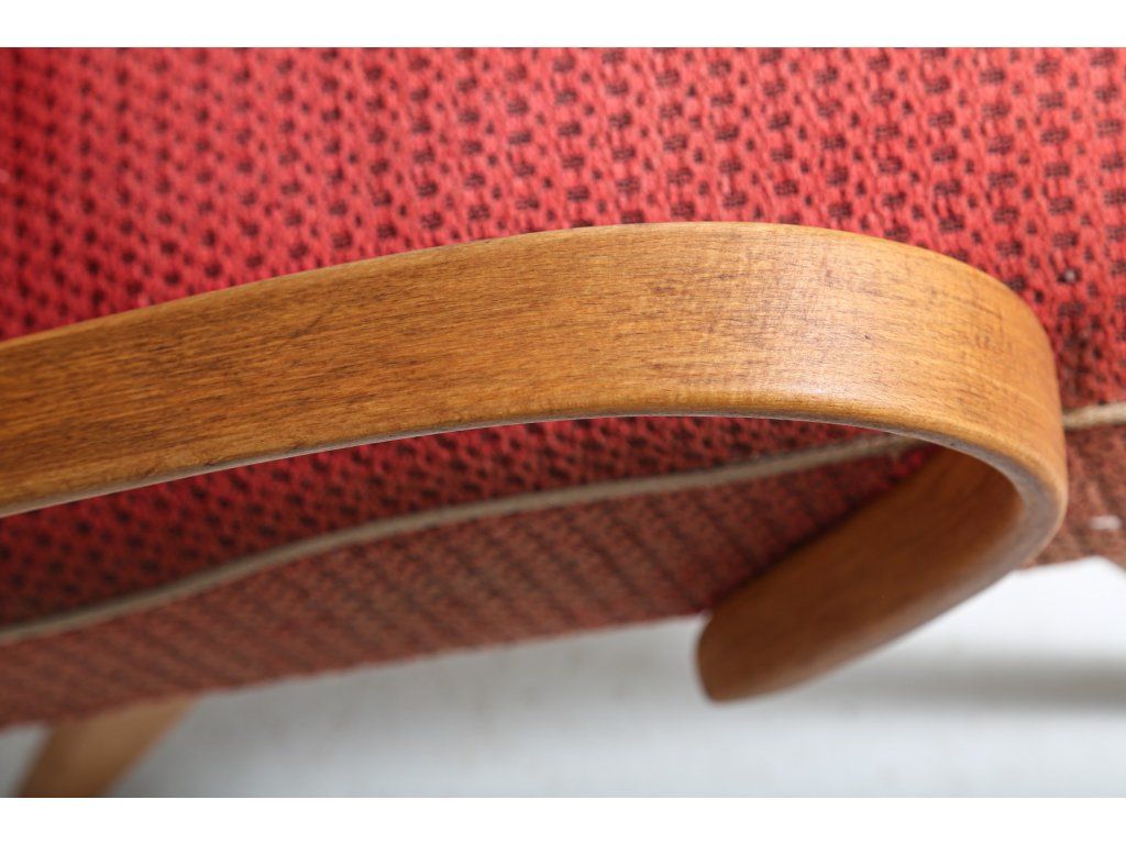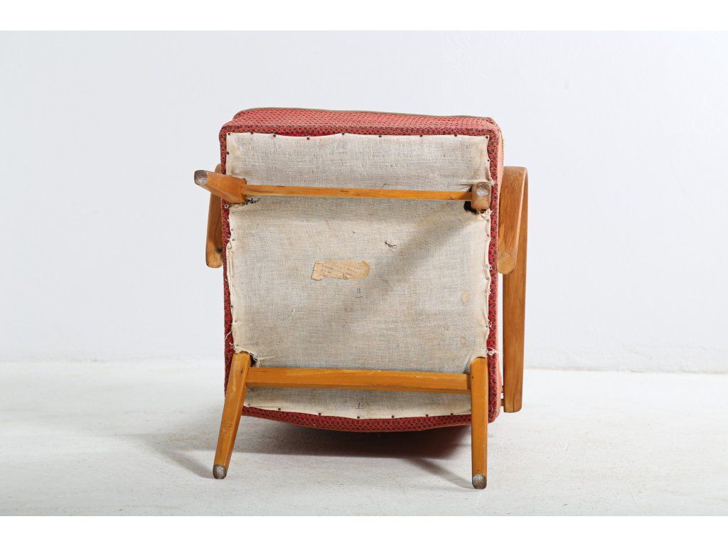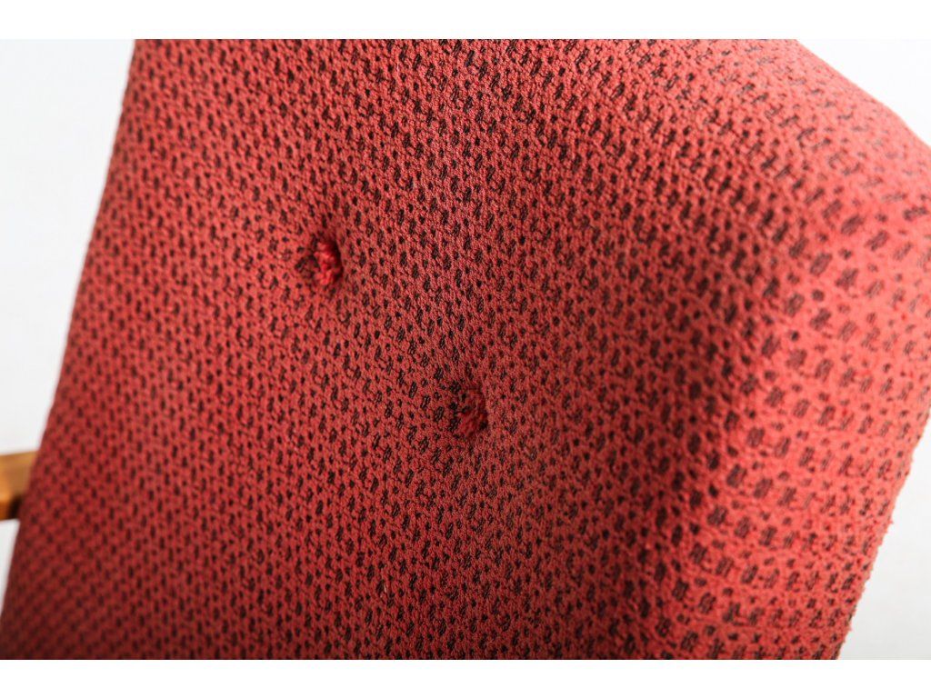 Dřevěná konstrukce stabilní. Potahová látka místy odřená. Chybí knoflíky na zádové opěrce.