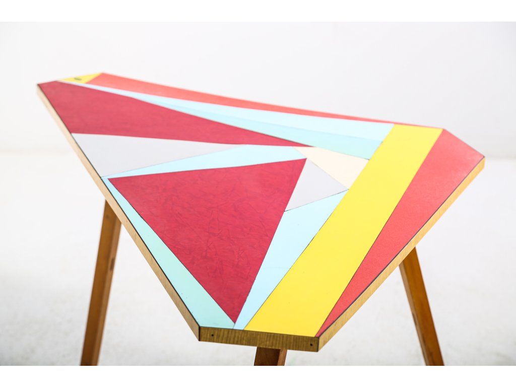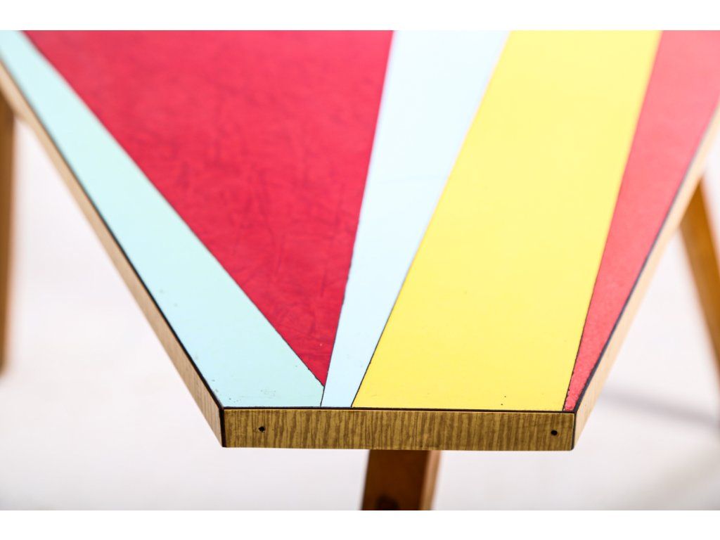Retro. Konstrukčně stabilní. Nalepené geometrické pruhy se místy odlupují. Používaný. Rozměry: výška 60 cm, šířka 108 cm, délka 60 cm.