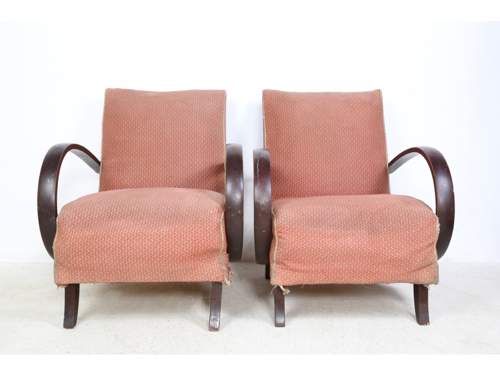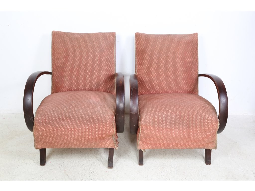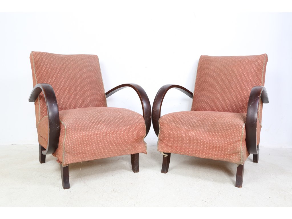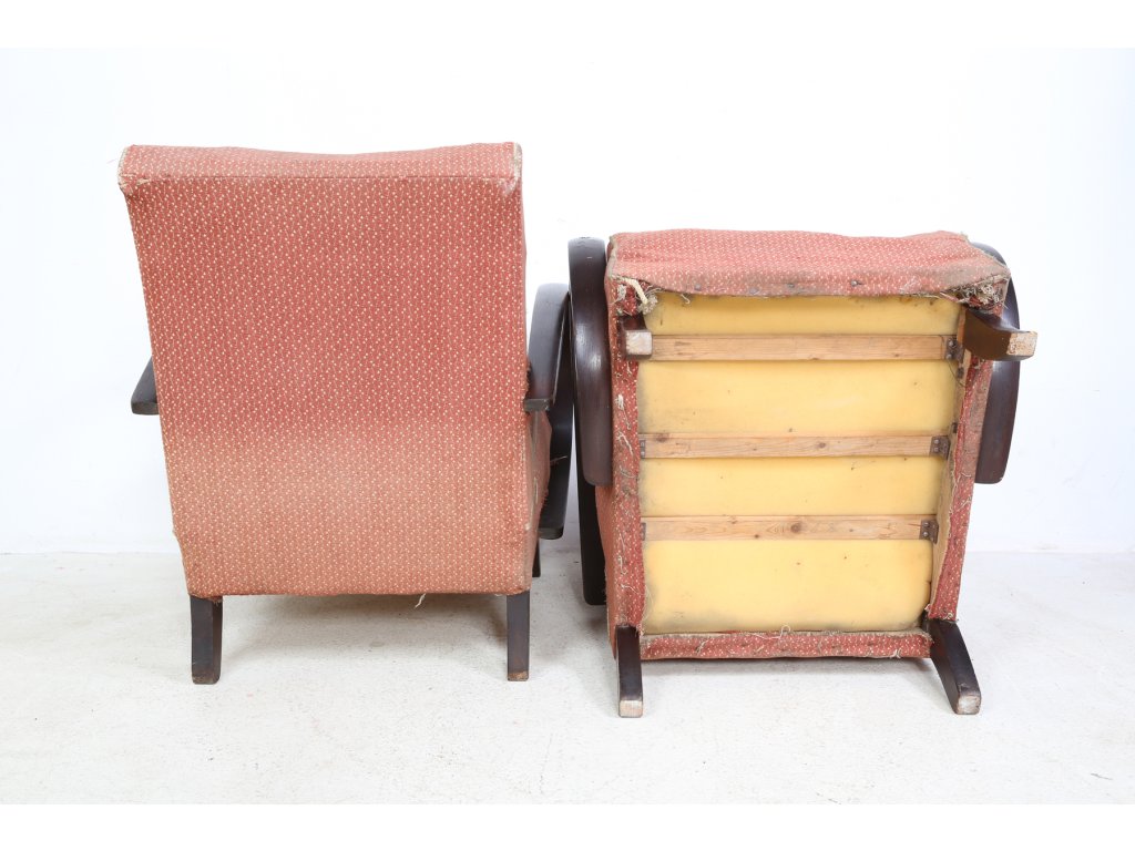Původní stav, vhodná k renovaci. U jednoho křesla prasklá noha. Používaná, stav viz foto. Rozměry: výška 77 cm, šířka 64 cm, hloubka 47 cm.