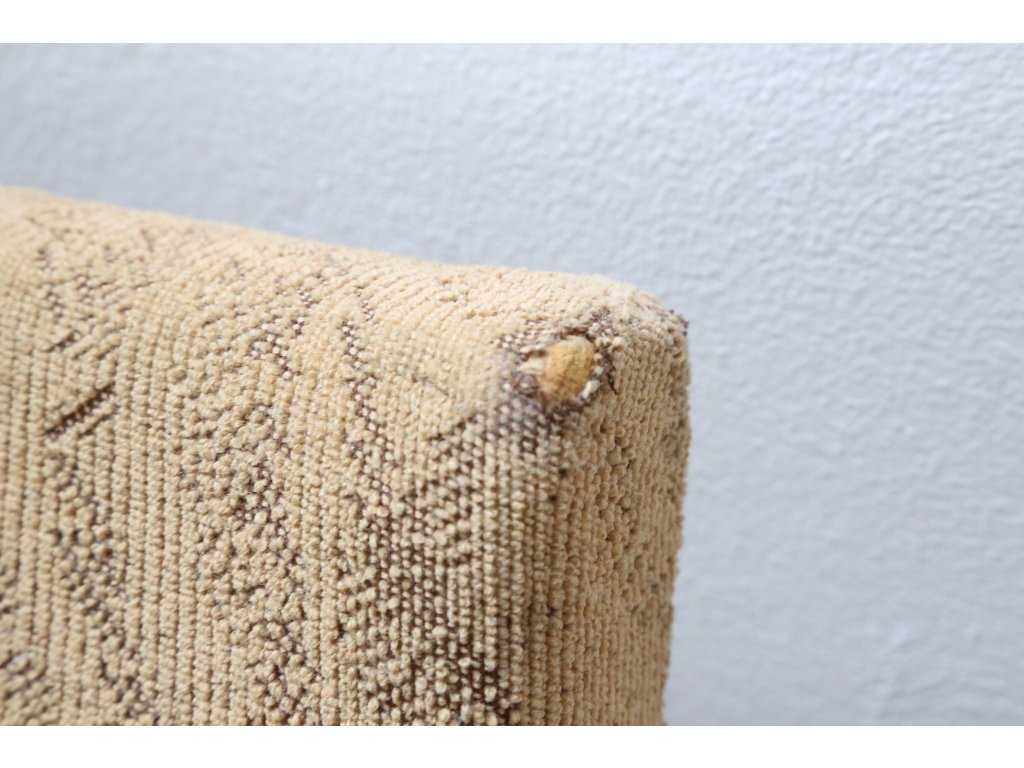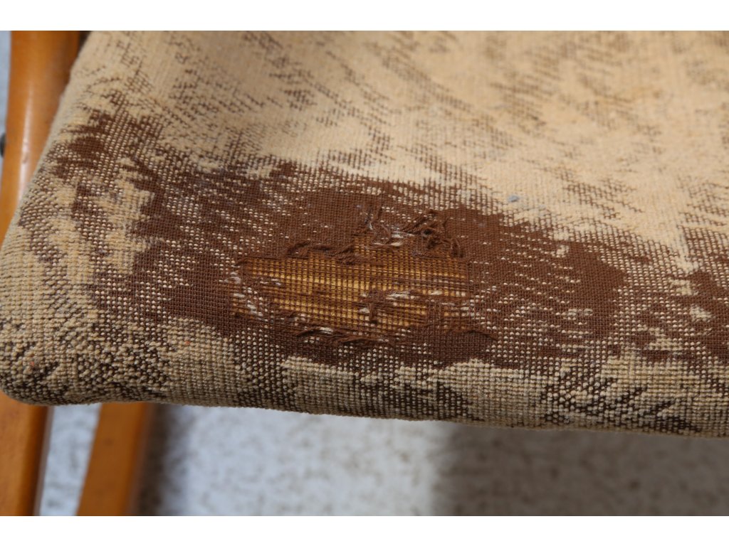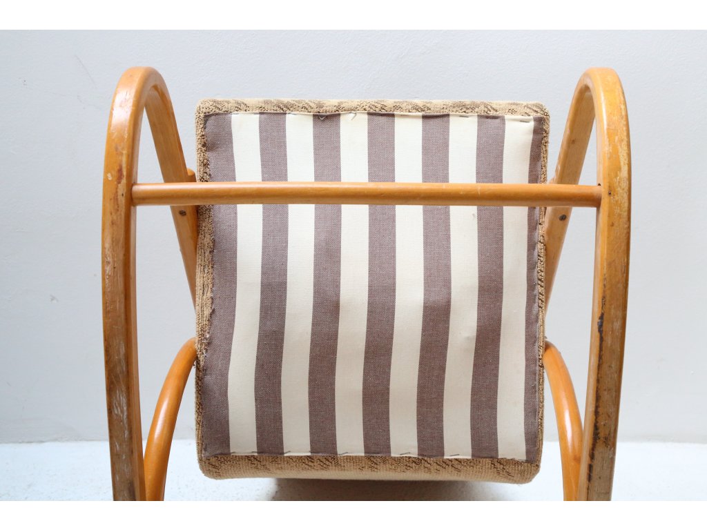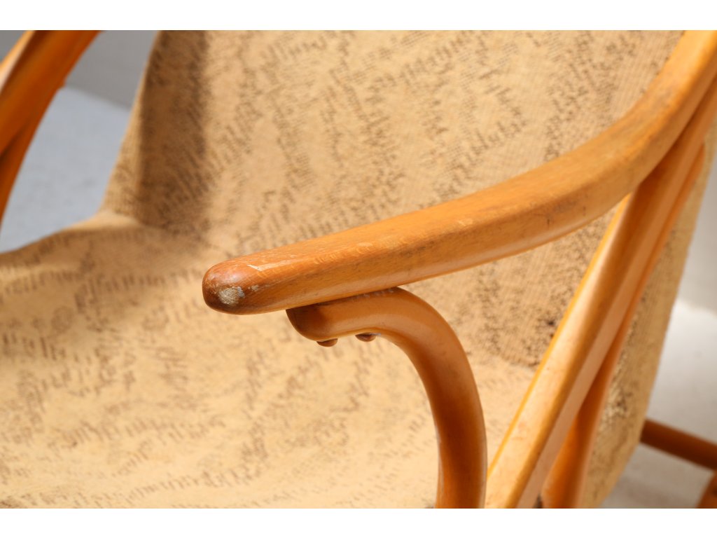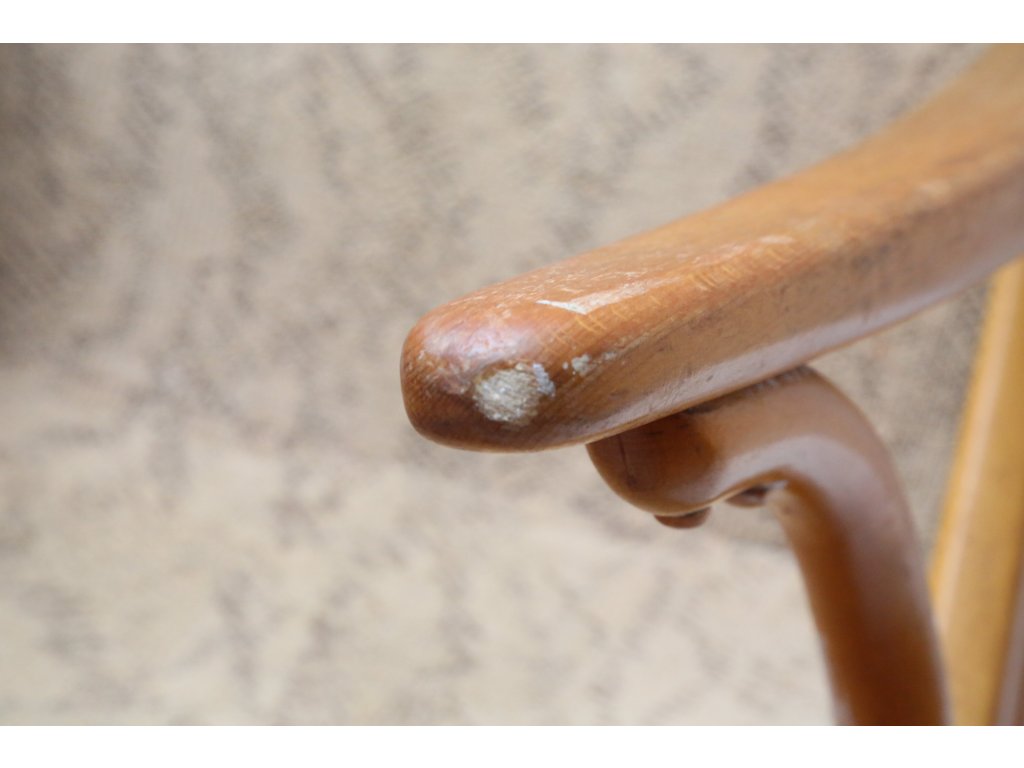 Ohýbané bukové dřevo. Levá opěrka s defektem, chybí šroubky. Čalounění k výměně. Rozměry: výška 43/86 cm, šířka 48 cm, délka 52 cm.
