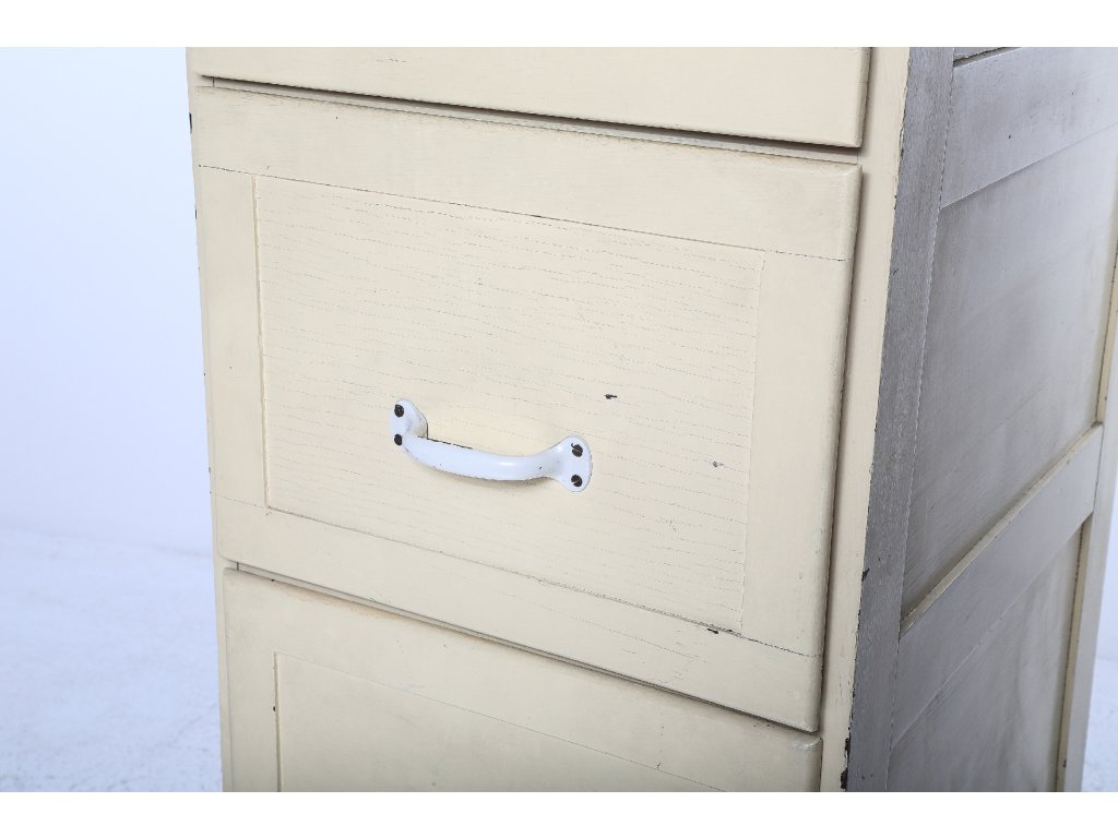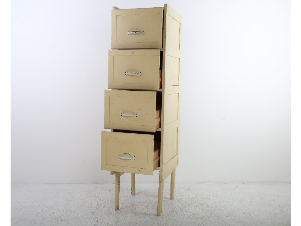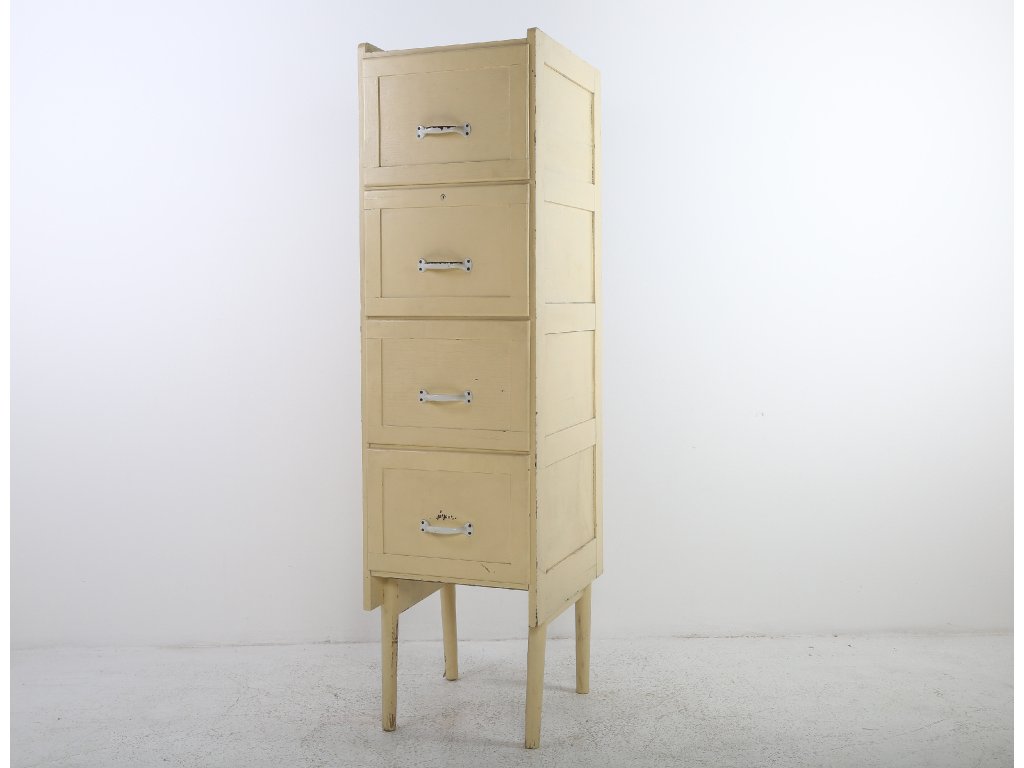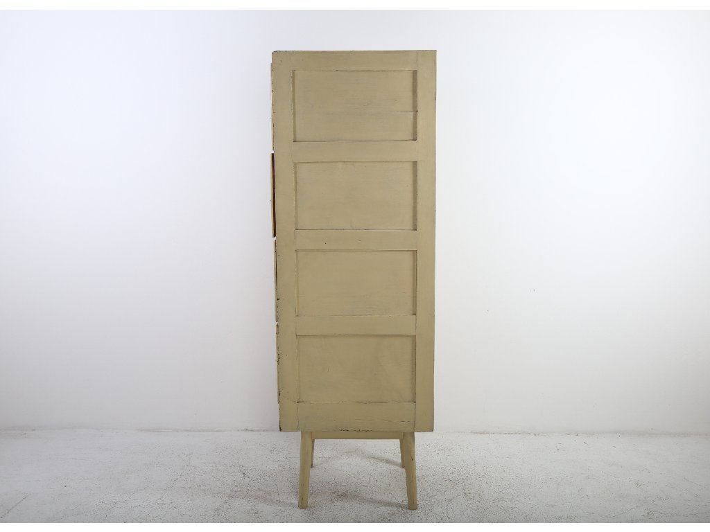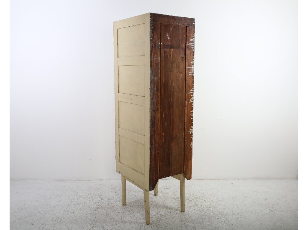 Konstrukčně stabilní, původní stav změněn nátěrovou barvou. Zásuvky, kovové úchyty. Používaná, stav viz foto. Rozměry: výška 177 cm, šířka 47 cm, hloubka 61 cm.