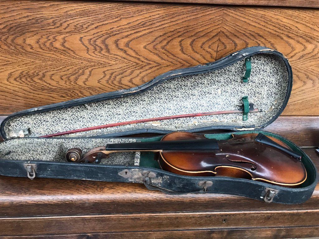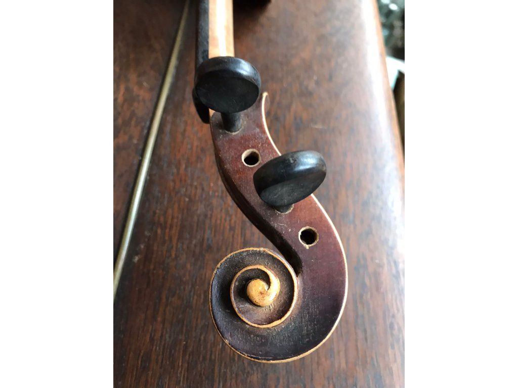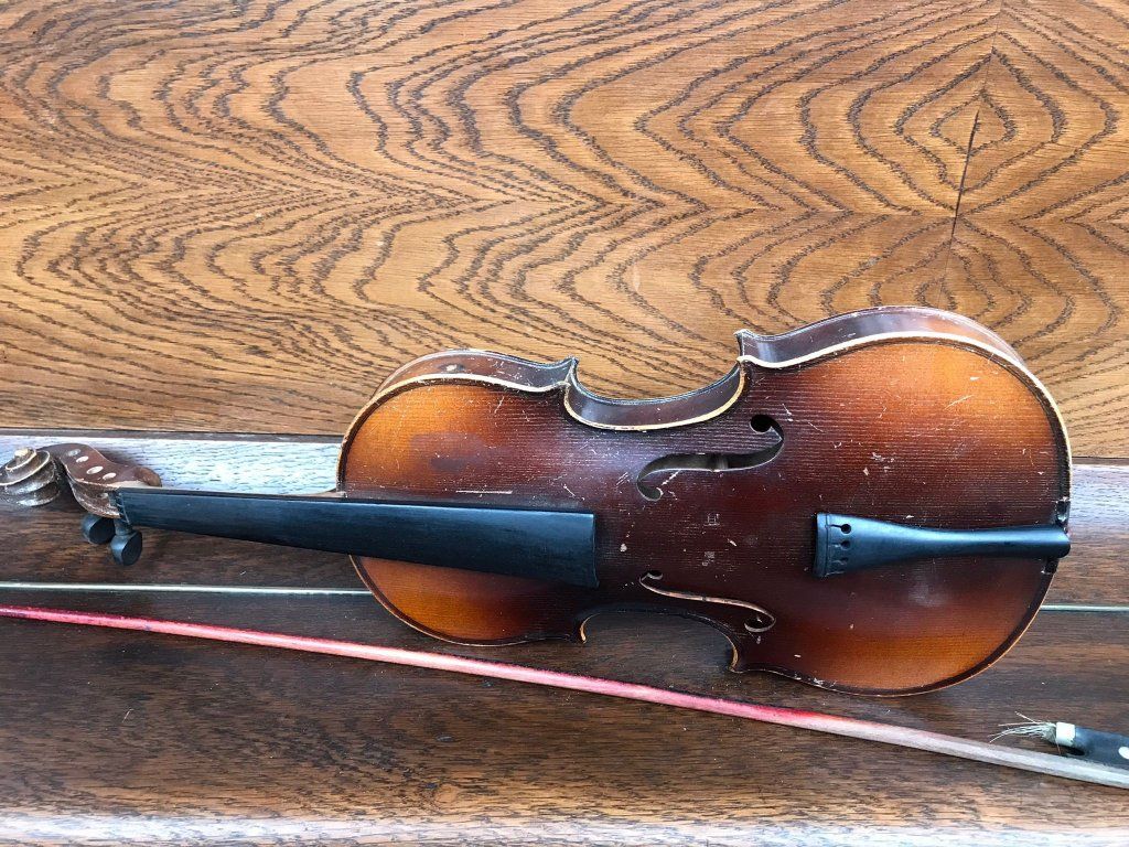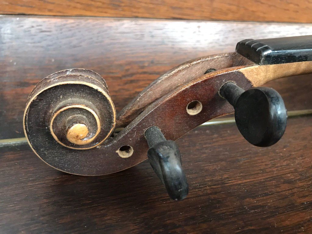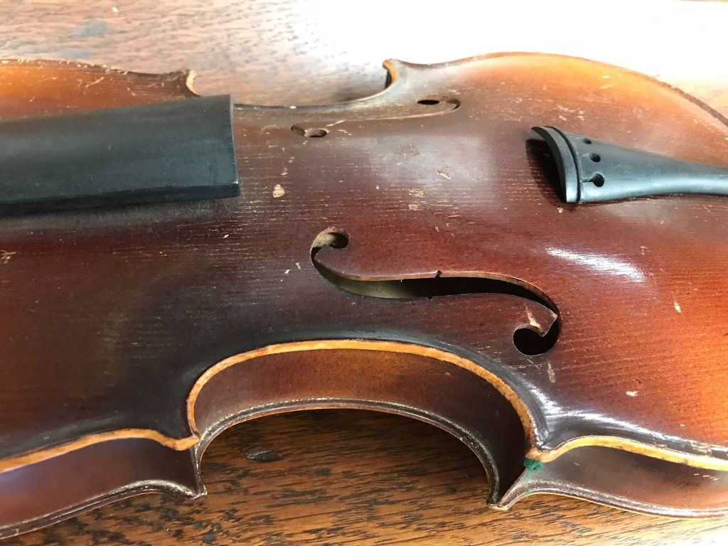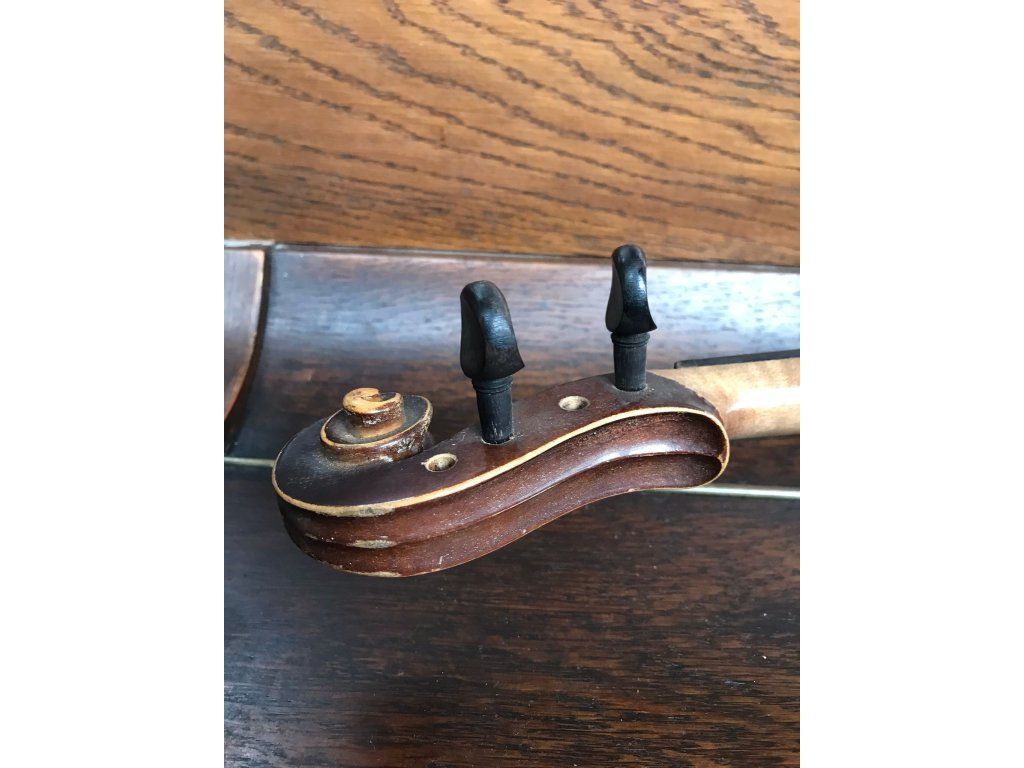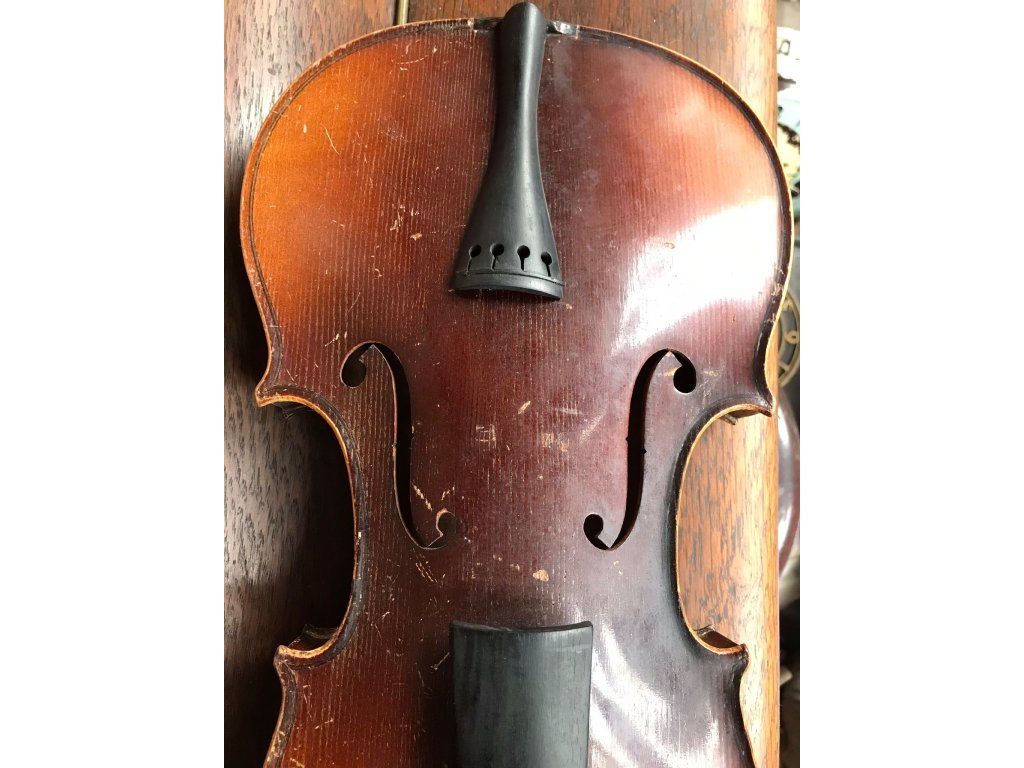 Chybí struny, kobylka a dva kolíky k utahování strun. Tělo poškrábané, bez prasklin.
