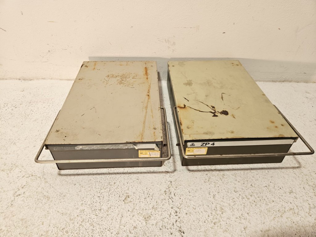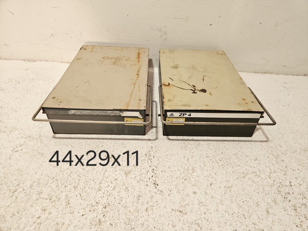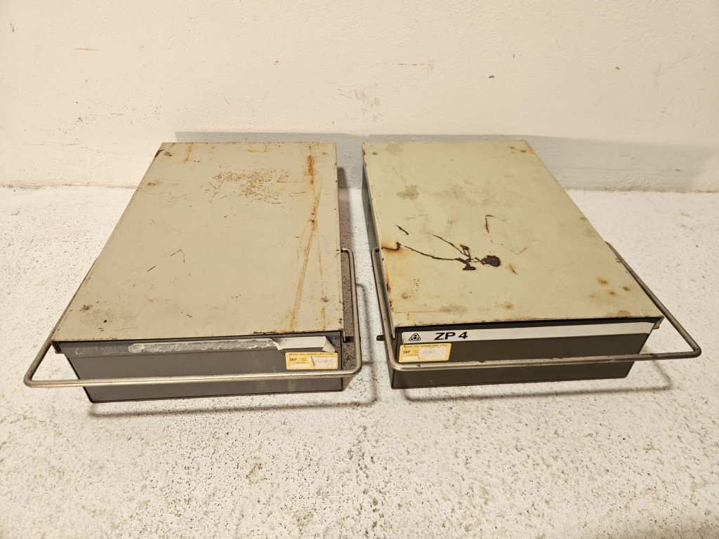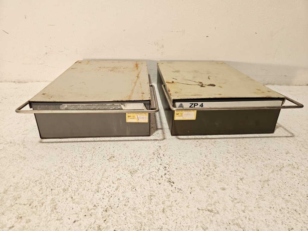 2x Lékařská industriální kartotéka. Používaná, stav viz foto. Retro, 50 léta. Rozměry: 44x29x11 cm. Uvedená cena za kus.
