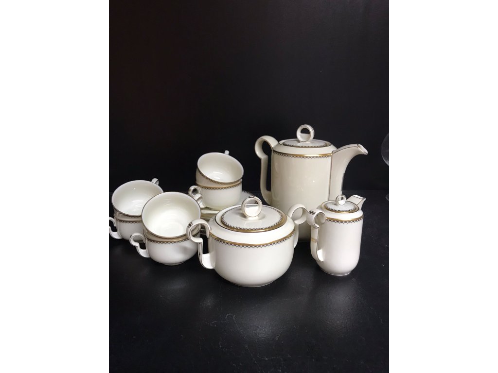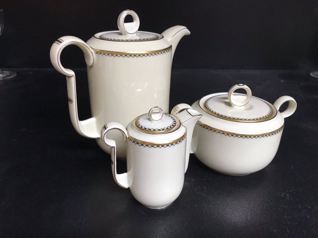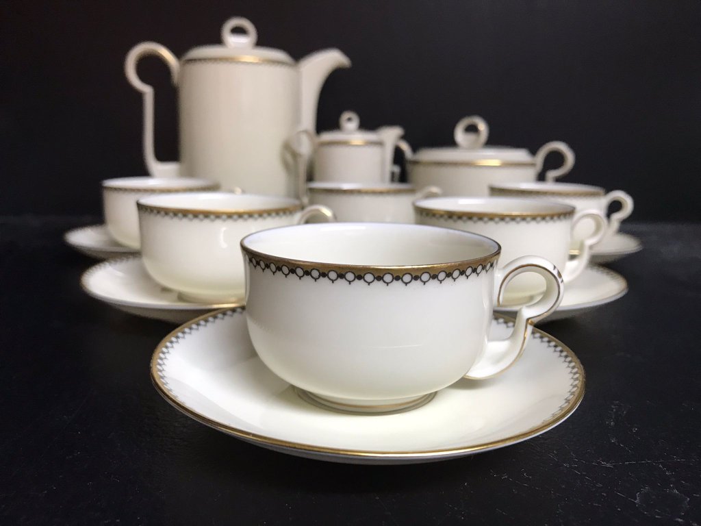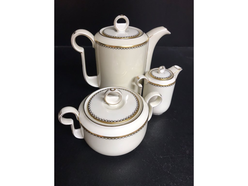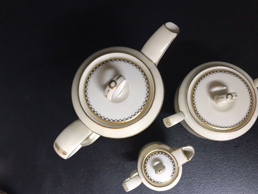 Art Deco. Servis označen 8571. Nepoužívaný, top stav. Rozměry: Konvička: výška 14 cm Mléčenka: výška 8 cm Cukřenka: výška 7 cm Hrnek: výška 4 cm, průměr 7 cm Podšálek: průměr 11,5 cm (H)
