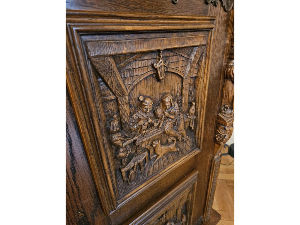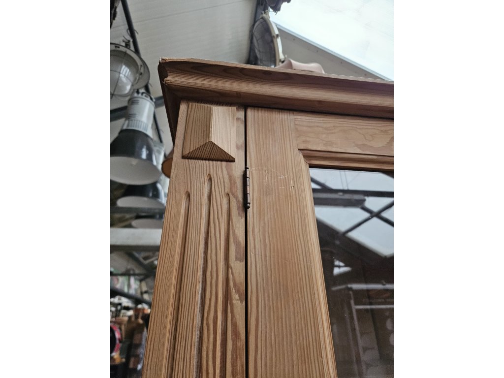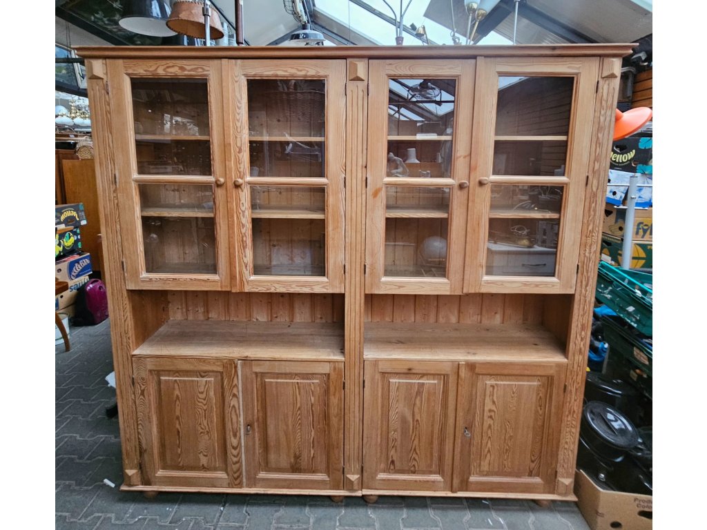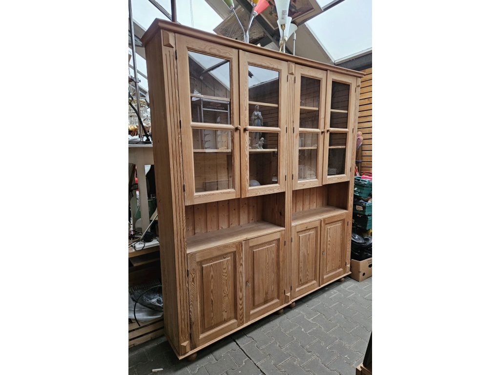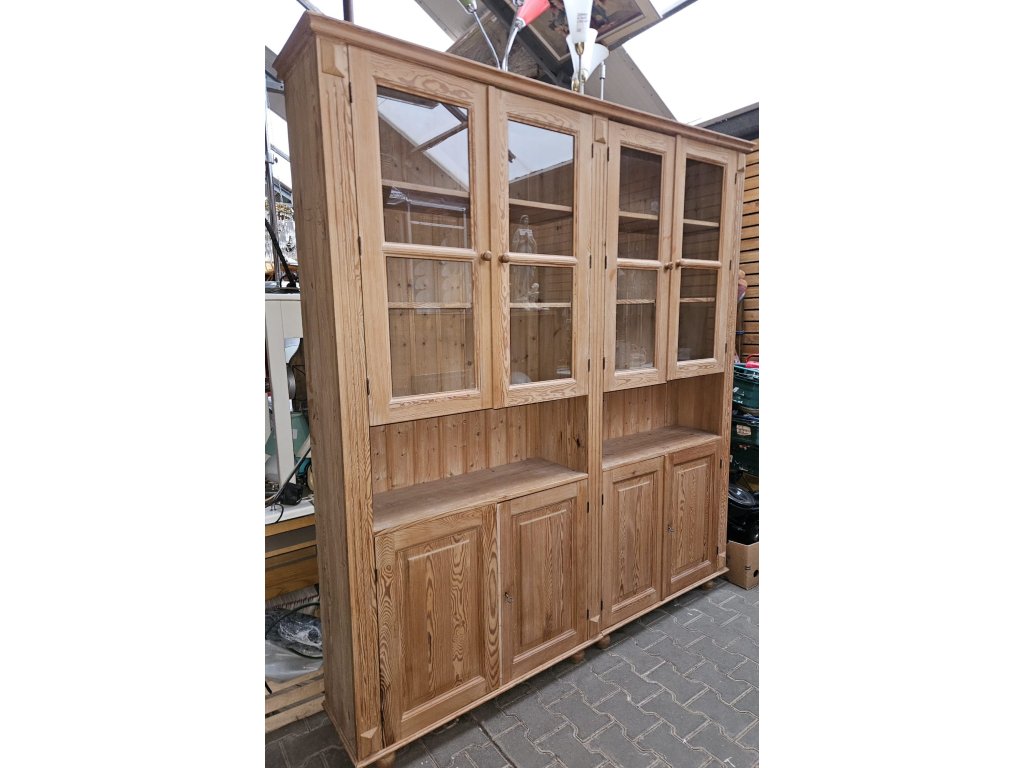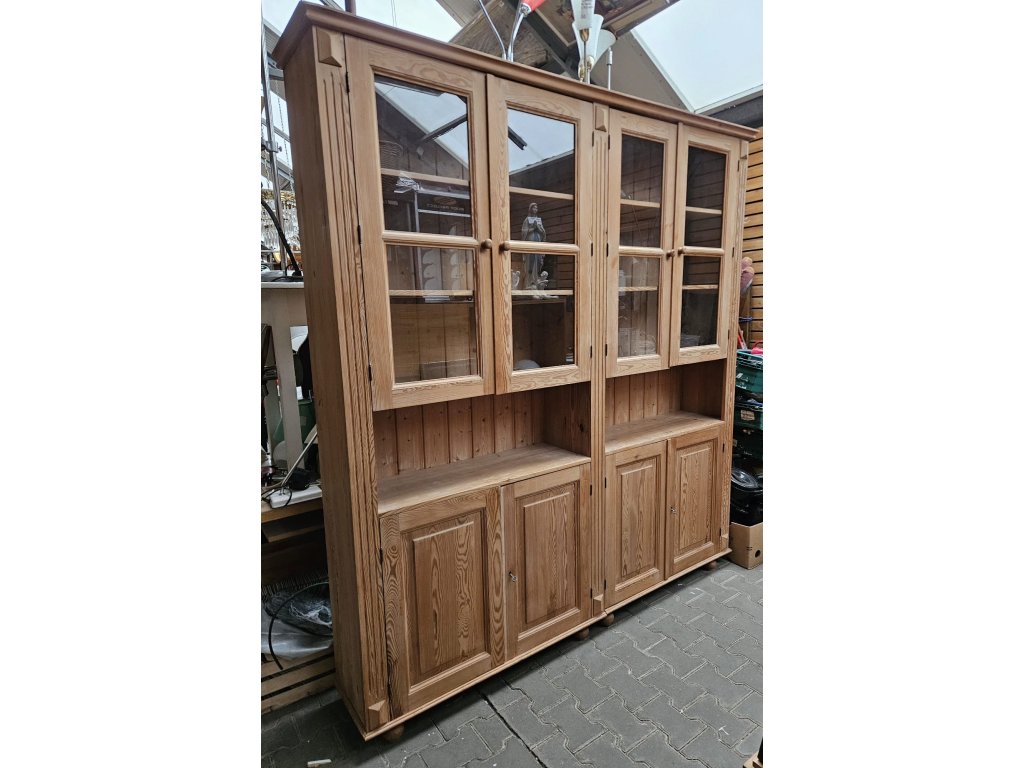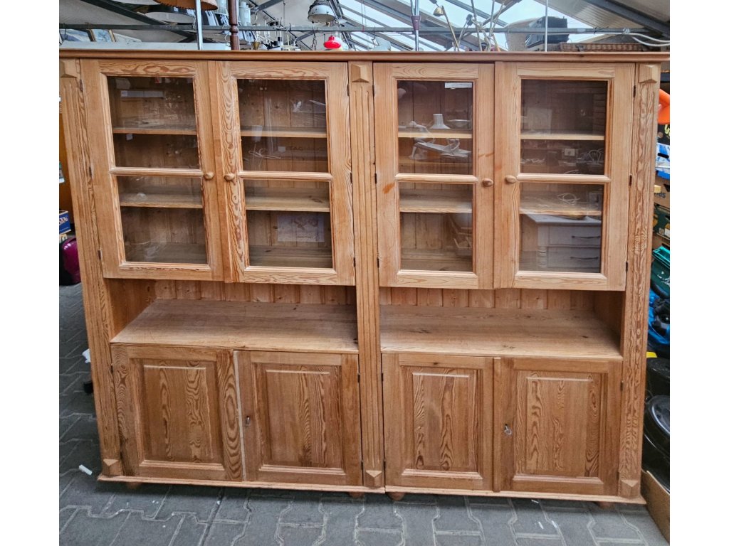 Konstrukčně stabilní. Chybí lišta u levých spodních dvířek- estetický nedostatek. Odražená levá horní lišta. Masiv, borovice. Rozměry: výška 225 cm, šířka 205 cm, hloubka 35 cm. Používaná.
