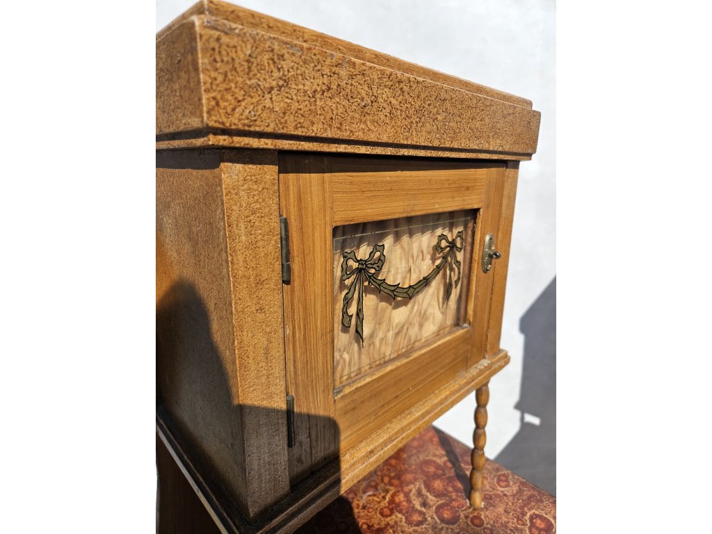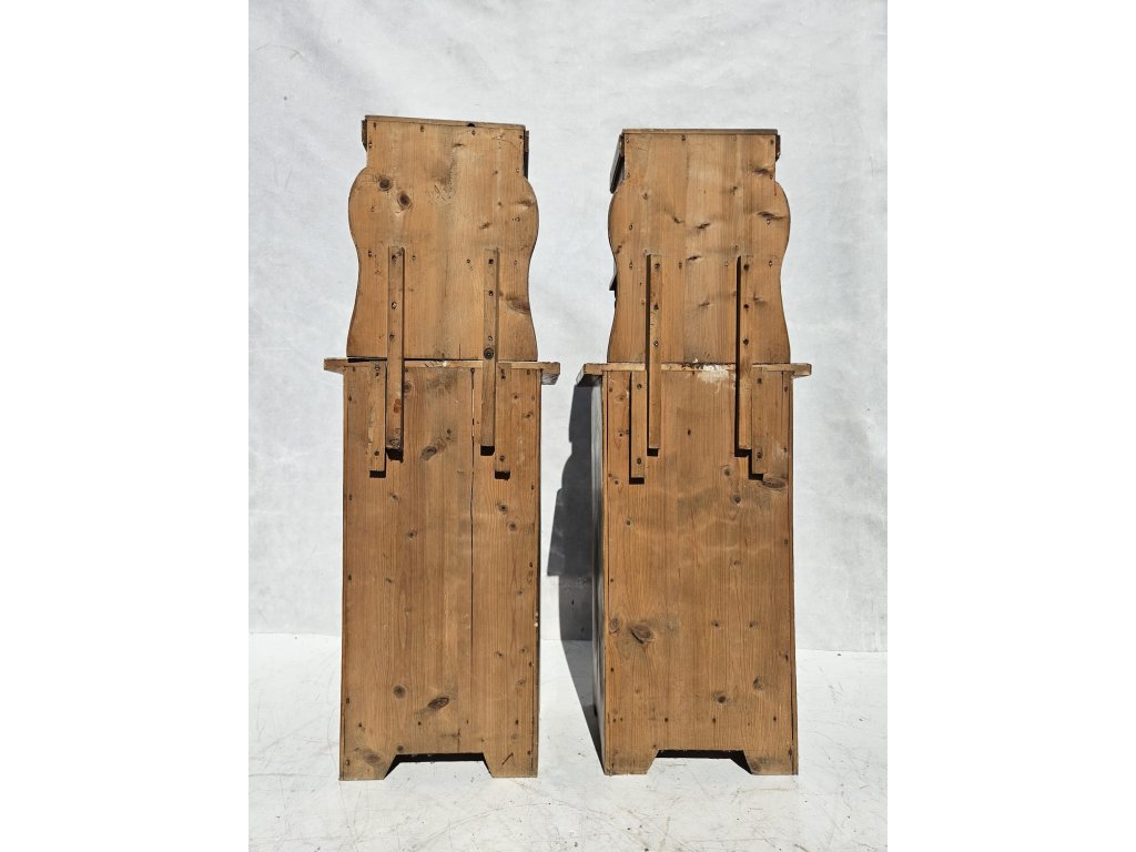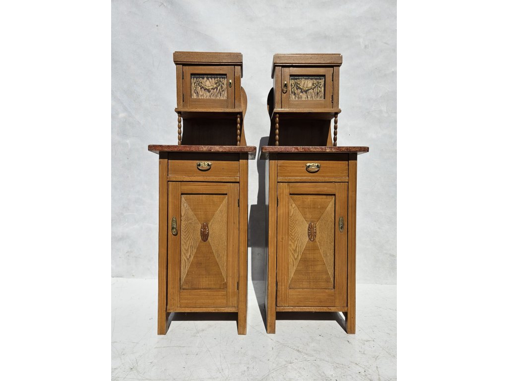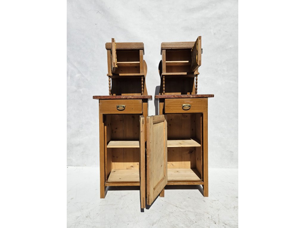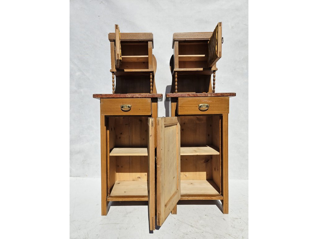 Párové noční stolky s nástavbou. Období konec 19. století. Používané, stopy po červotoči a oděrky místy. Zachovalý stav. Rozměry: výška 85 cm, nástavec 48 cm, čířka 47 cm, hloubka 30 cm.