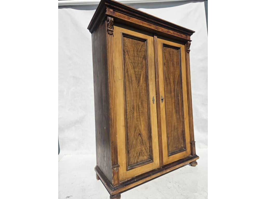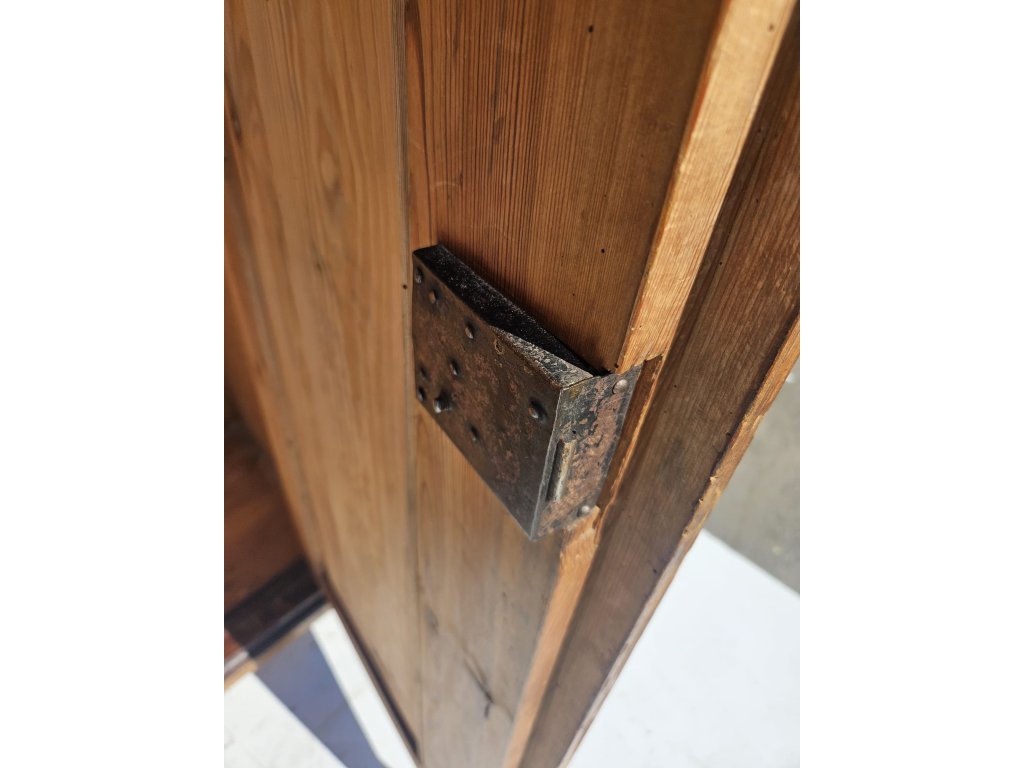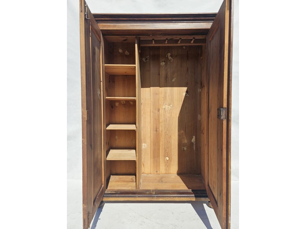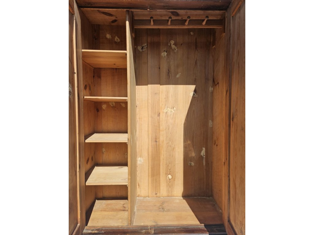 Celodřevěná. Kombinace závěsných háčků a police. Používaná, oděrky místy. Stoppy po červotoči. Rozměry: výška 175 cm, šířka 115 cm, hloubka 50 cm.