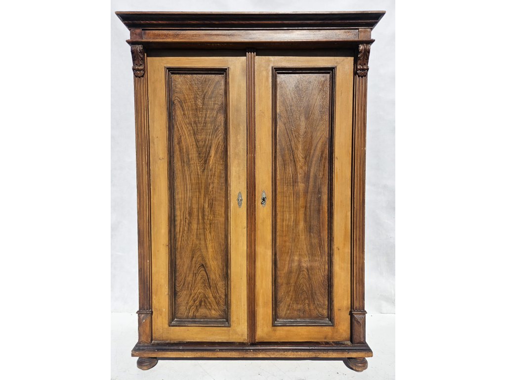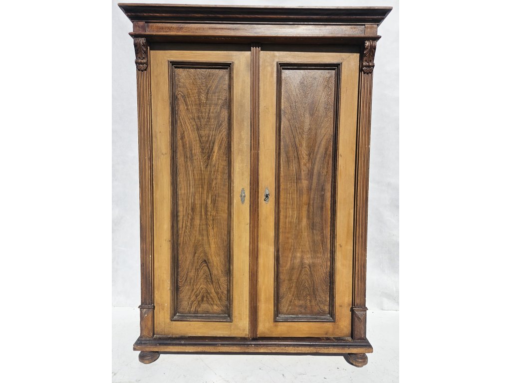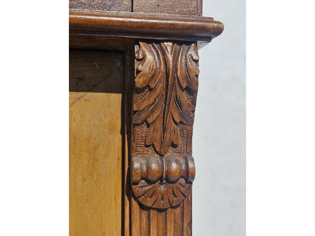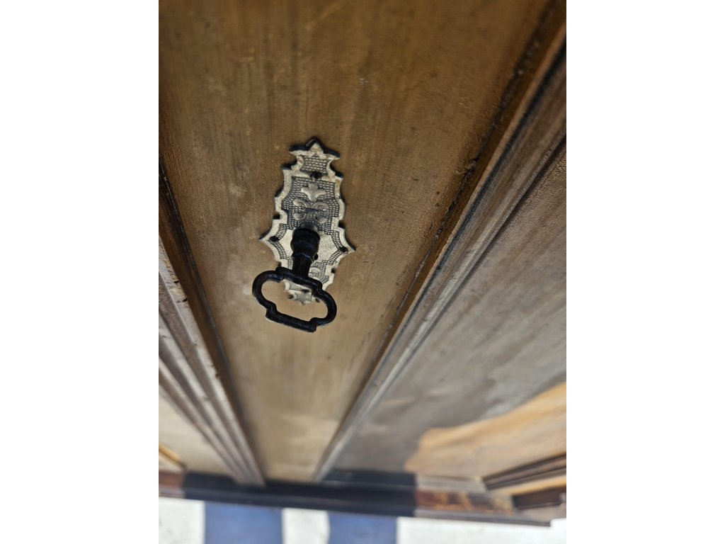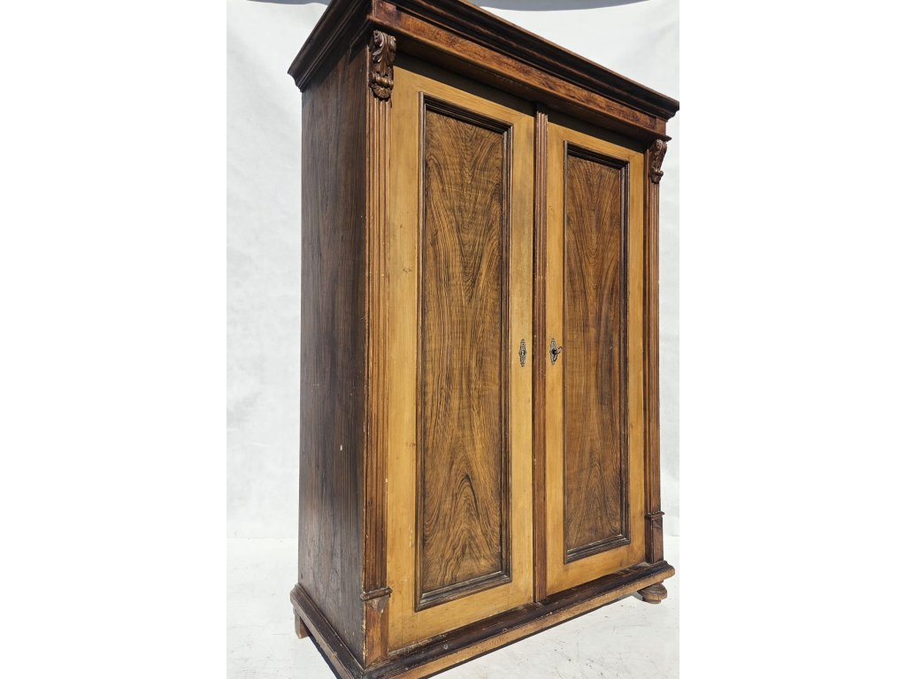 Celodřevěná. Kombinace závěsných háčků a police. Používaná, oděrky místy. Stoppy po červotoči. Rozměry: výška 175 cm, šířka 115 cm, hloubka 50 cm.