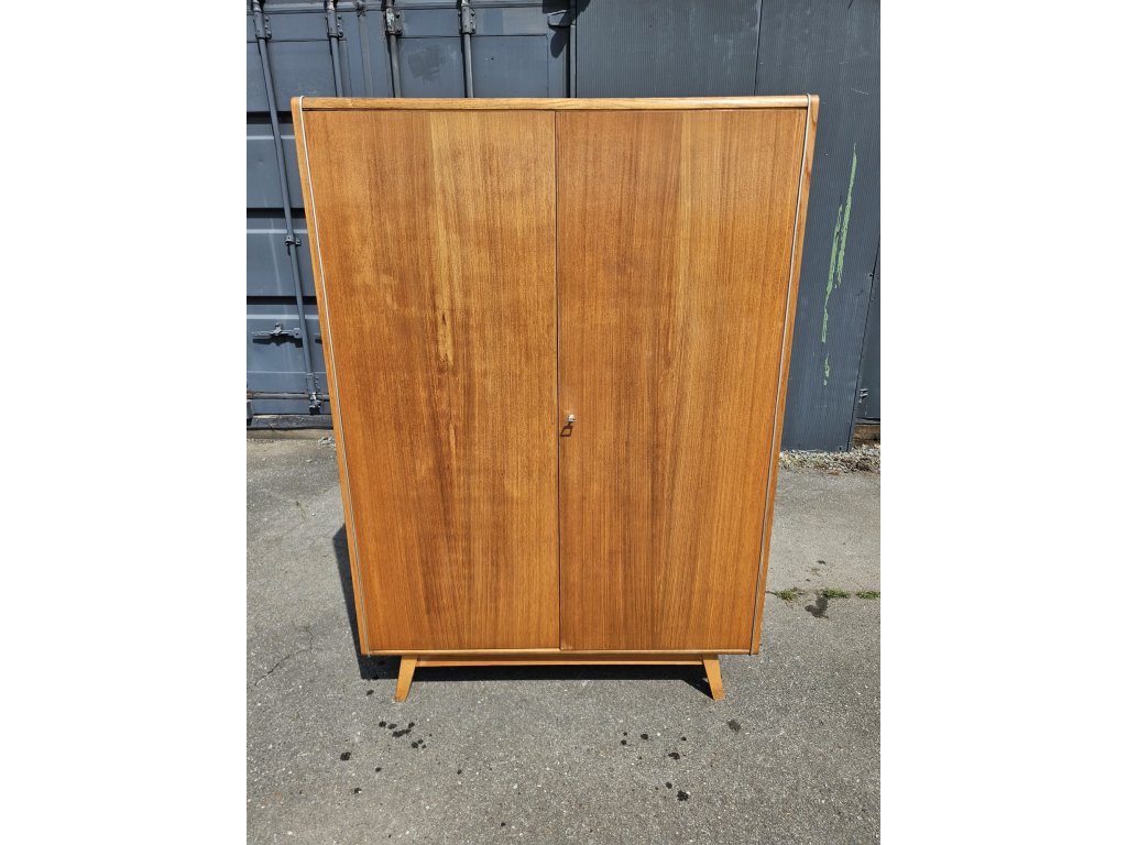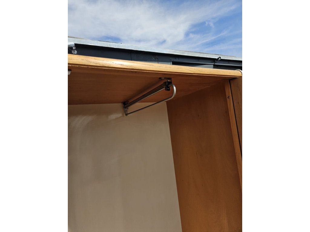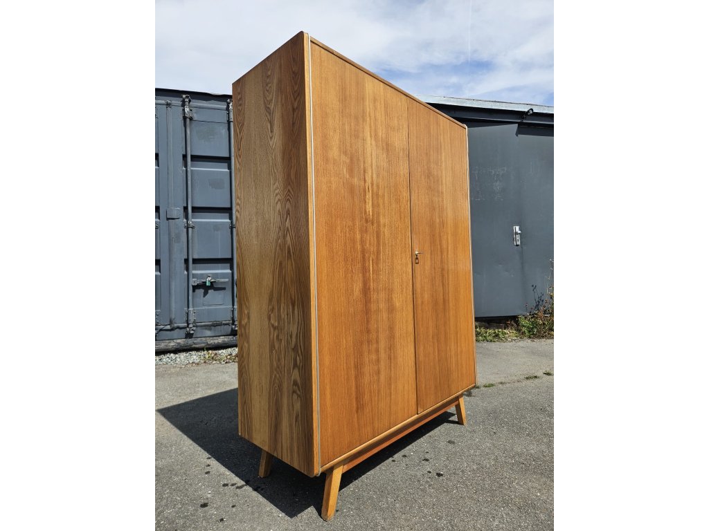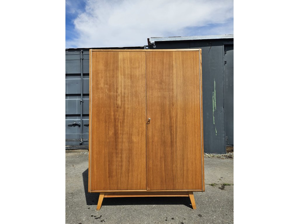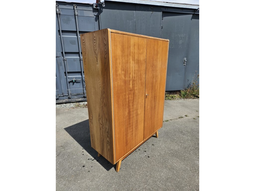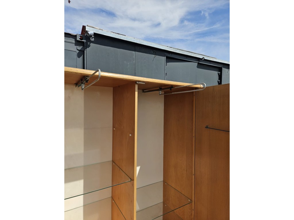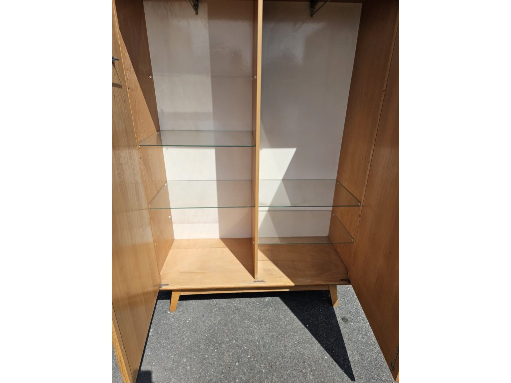 Velmi dobrý stav. Konstrukčně stabilní. Vnitřní část s výsuvnými kovovými ramínky a skleněnými policemi. Rozměry: výška 169 cm, hloubka 50 cm, délka 119 cm.