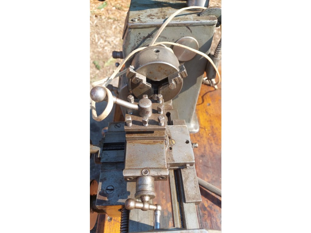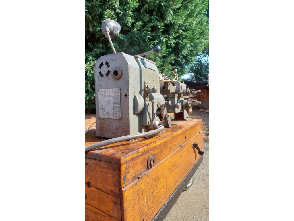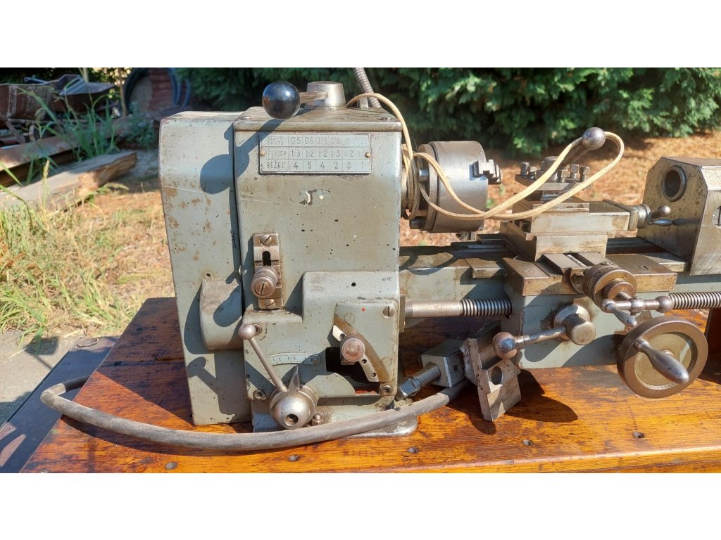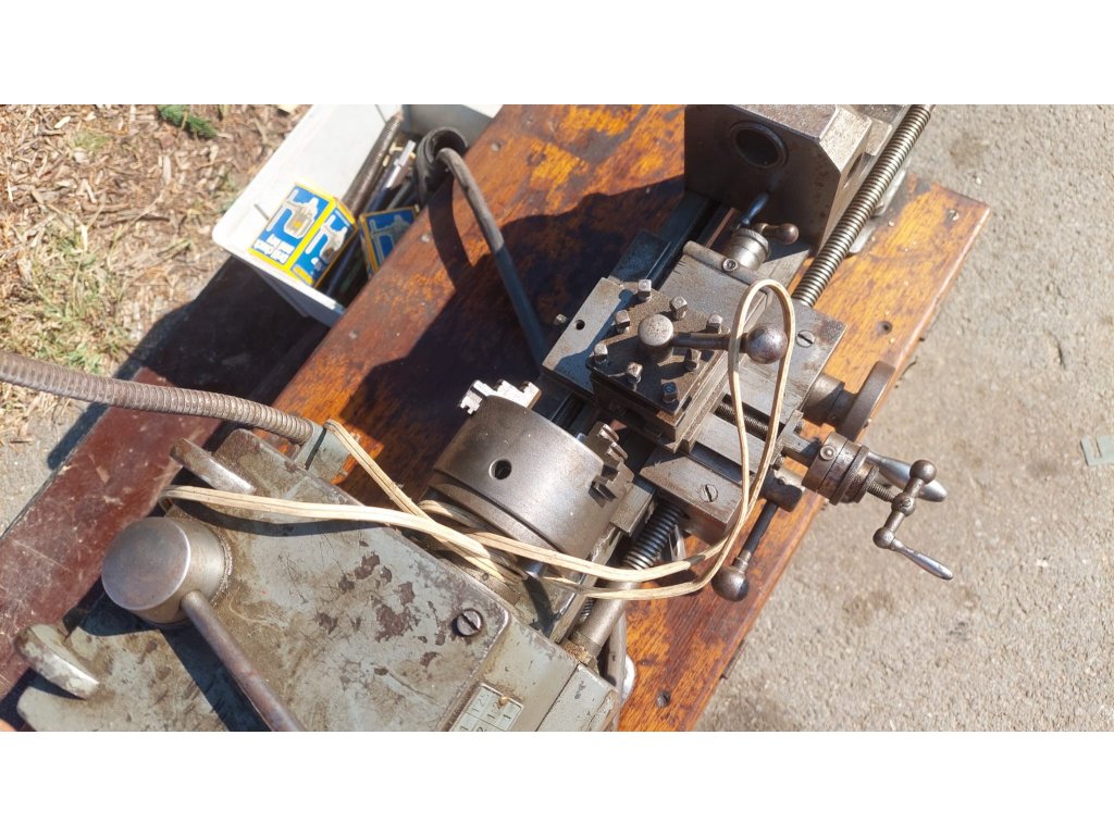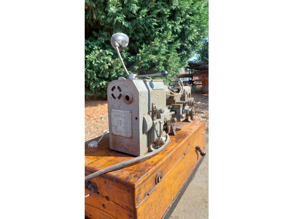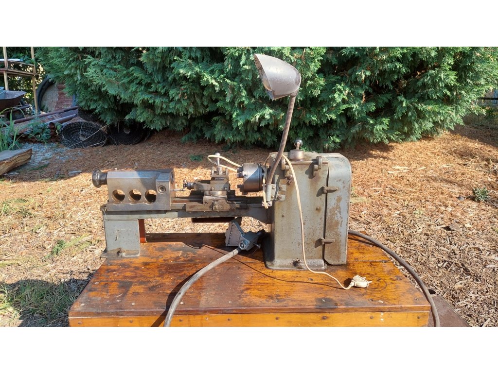 Soustruh mini stolní, industriální ponk, kovoobráběcí stroj.