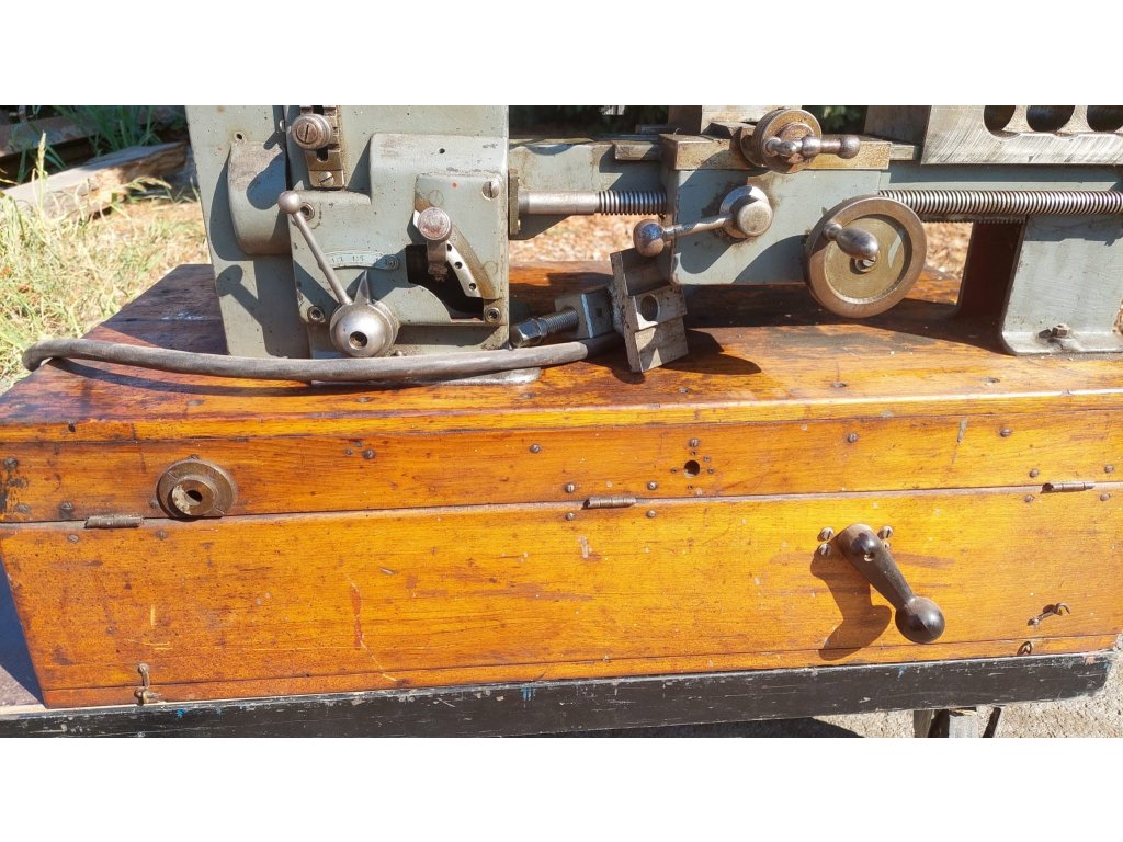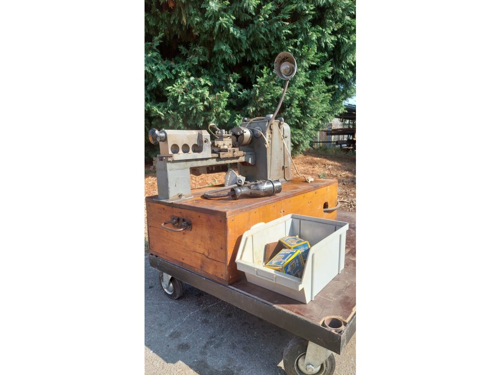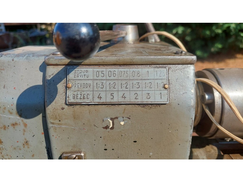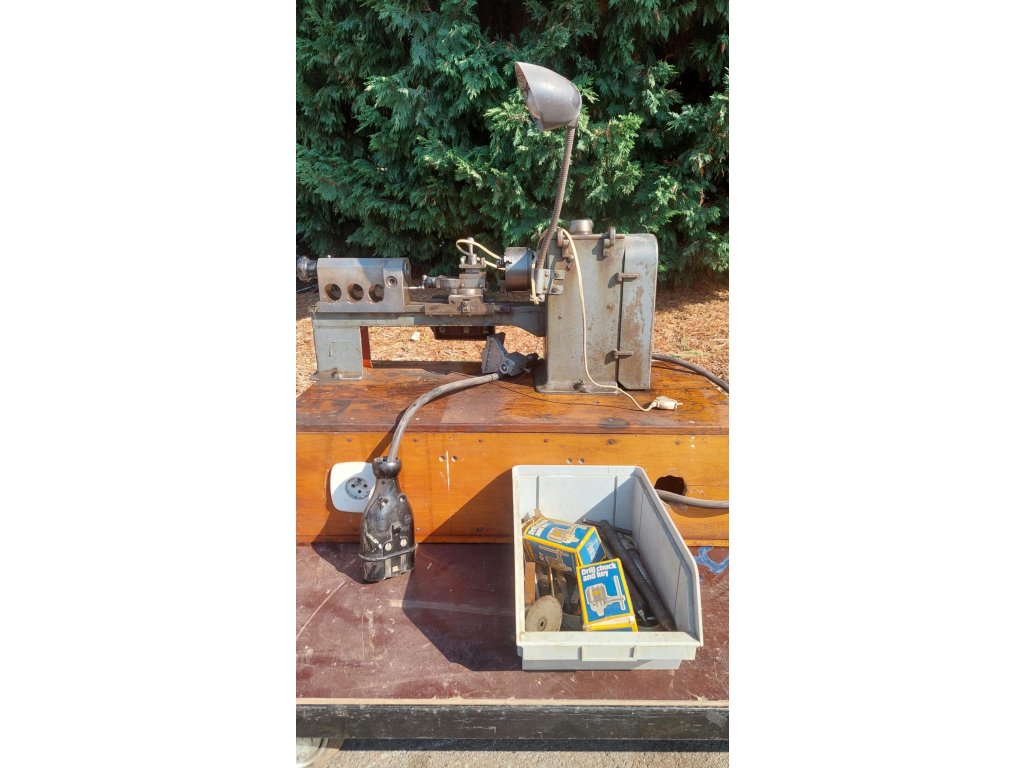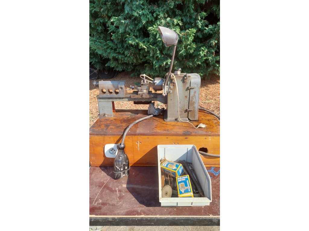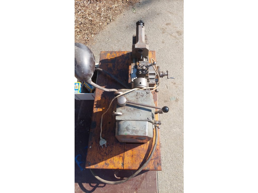 Soustruh mini stolní, industriální ponk, kovoobráběcí stroj.