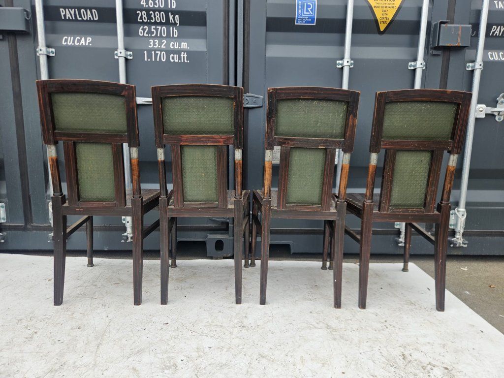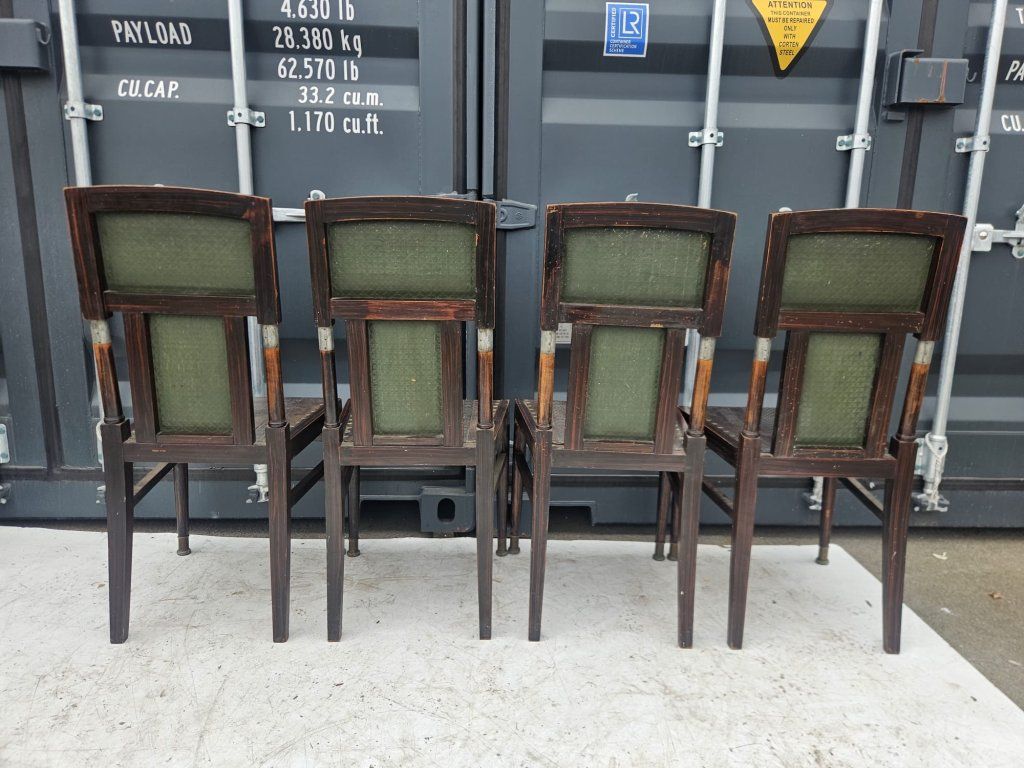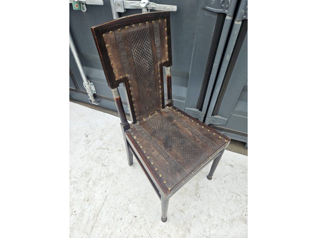Geometrická secese, 20. léta. Kombinace dřeva a kožených sedáků. Kovové cvoky a doplňky. Stopy po červotoči. Konstrukčně stabilní, oděrky na kůži místy. Používané, stav odpovídající stáří židlí. Uvedená cena za set.