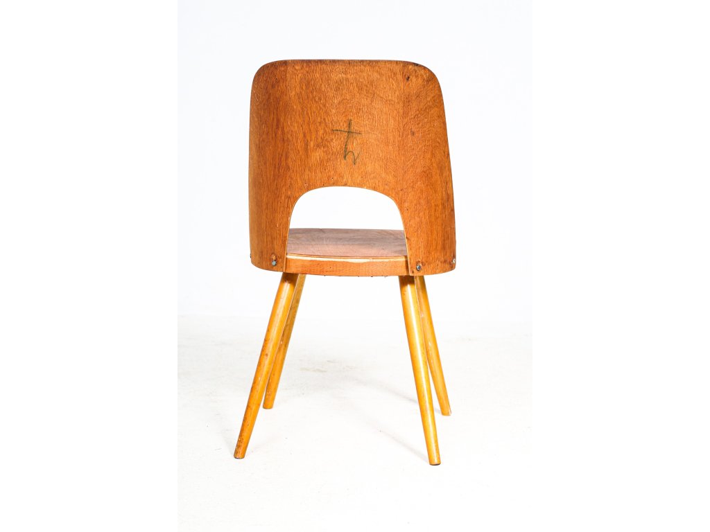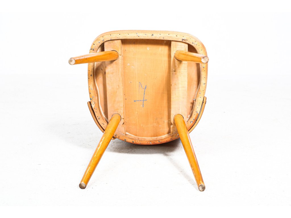 Konstrukce z lepené a ohýbané překližky, dubové nohy. Drobné praskliny.