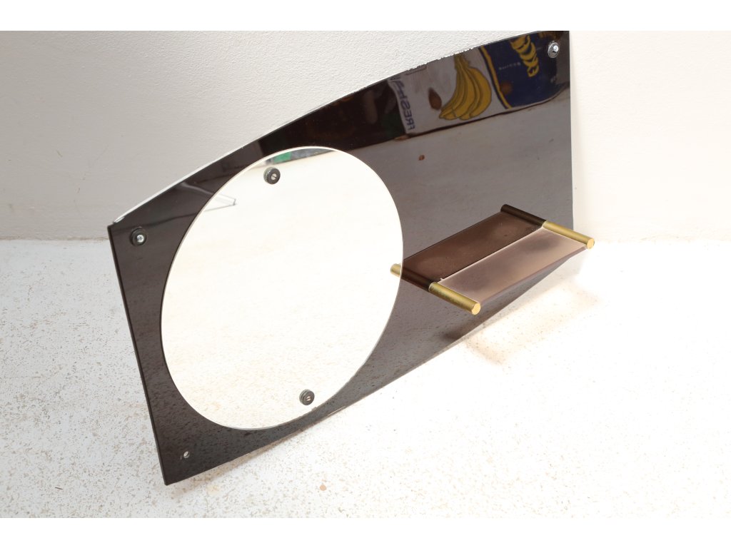 Opaxitová deska s kulatým zrcadlem a odkládací poličkou. Zavěšení na 4 šrouby. Rozměry: 69x41 cm.